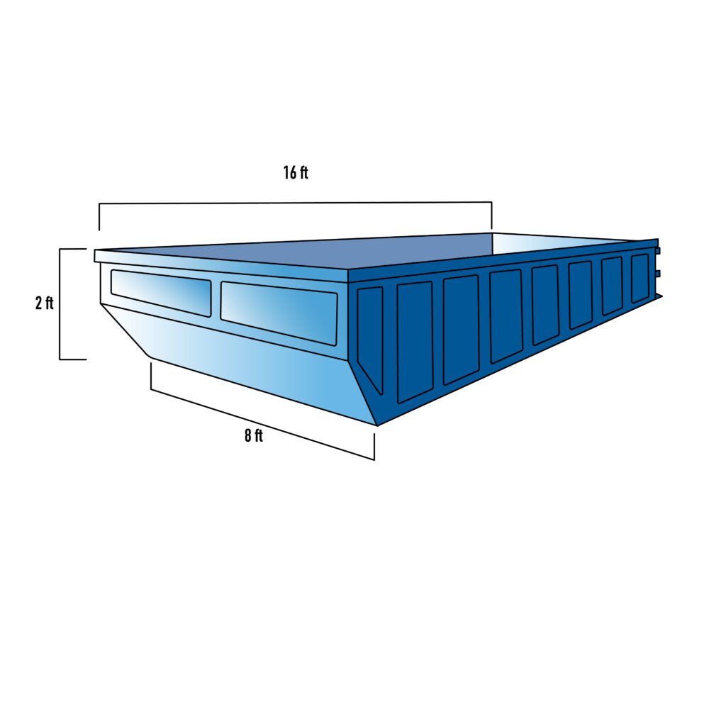 Our 10-yard lowboy dumpsters are typically 16 feet long, 8 feet wide, and 2 feet tall. These dimensions make them easy to load while still offering a 10 cubic yard capacity for heavy materials.