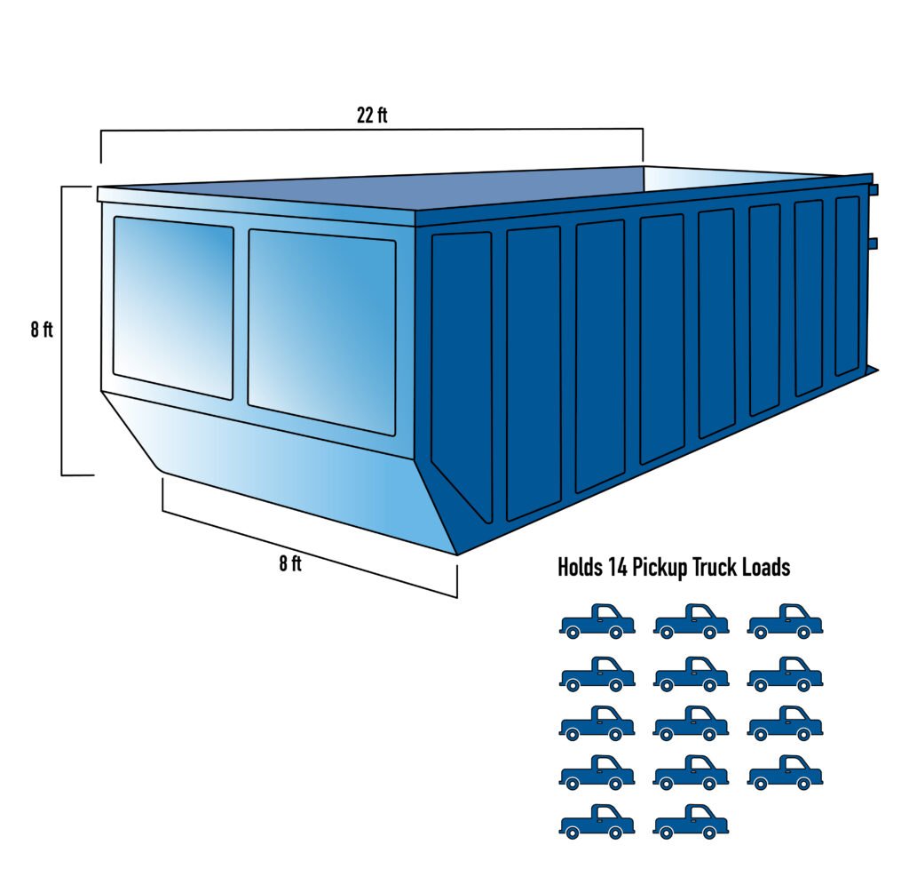 Our 40 yard dumpsters are usually 22 feet long, 8 feet wide and 8 feet tall. These dimensions can vary from one dumpster model to another. However, the capacity of the dumpster delivered will always be 40 cubic yards minimum.
